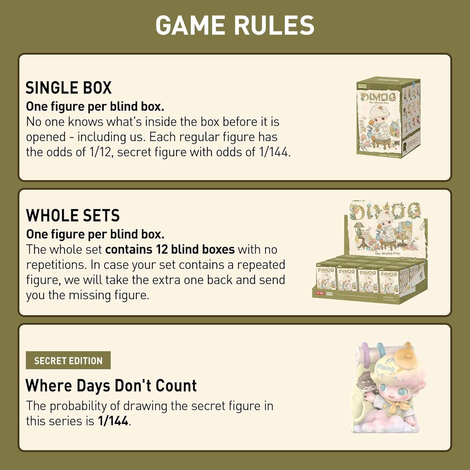 POP MART DIMOO The Missing Day Series Figures: The blind box contains a random figure from a specific series. Each blind box only contains one figure. No one, including us, knows what's inside. This collection contains 12 blind box figures, one of them might be the secret edition.