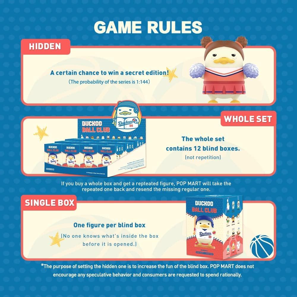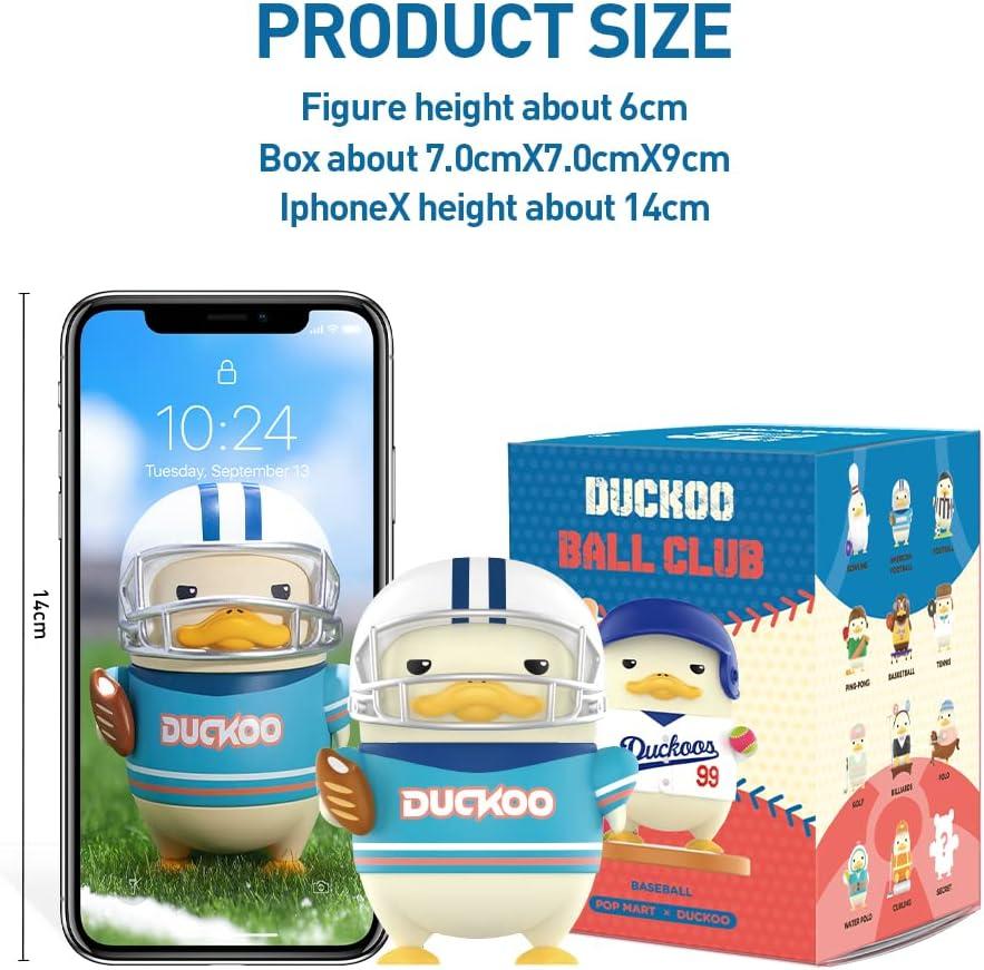 POP MART DUCKOO Ball Club Series: The blind box contains a random figure from a specific series. Each blind box only contains one figure. No one, including us, knows what's inside. This collection contains 12 blind box figures, one of them might be the secret edition.