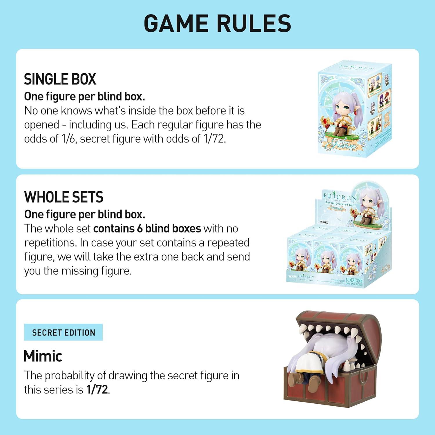 POP MART Frieren: Beyond Journey's End Series Figures: The blind box contains a random figure from a specific series. Each blind box only contains one figure. No one, including us, knows what's inside. This collection contains 6 blind box figures, one of them might be the secret edition.