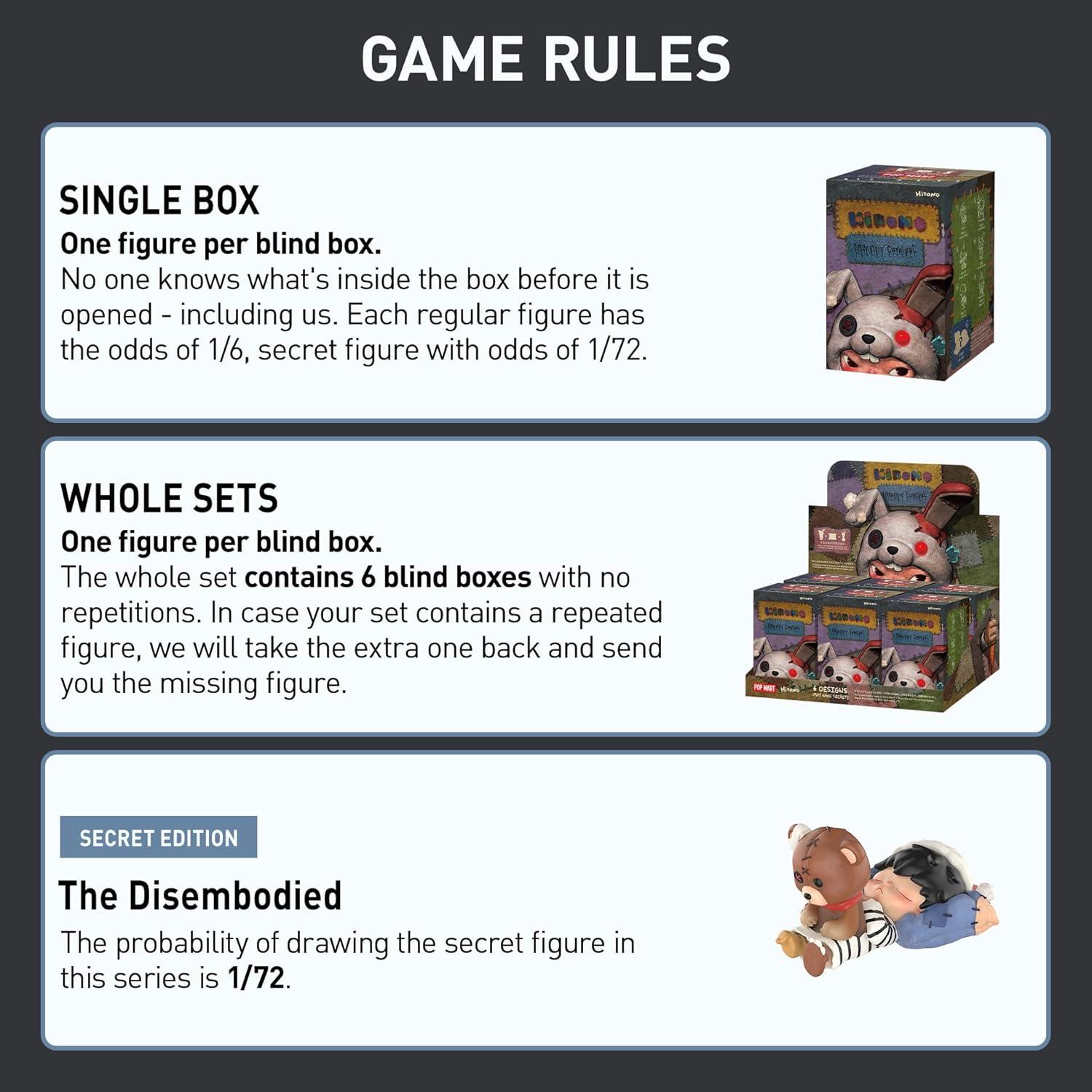 POP MART Hirono Monsters' Carnival Series: The blind box contains a random figure from a specific series. Each blind box only contains one figure. No one, including us, knows what's inside. This collection contains 6 blind box figures, one of them might be the secret edition.