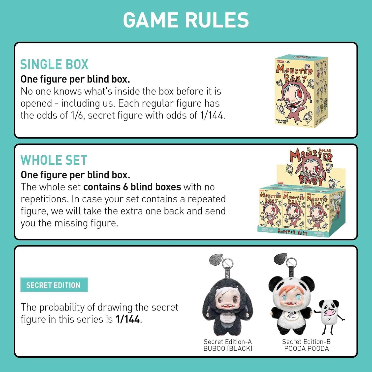POP MART POLAR-Monster Baby Collection Series Plush Pendant Ver.1: The blind box contains a random figure from a specific series. Each blind box only contains one figure. No one, including us, knows what's inside. This collection contains 6 blind box figures, one of them might be the secret edition.