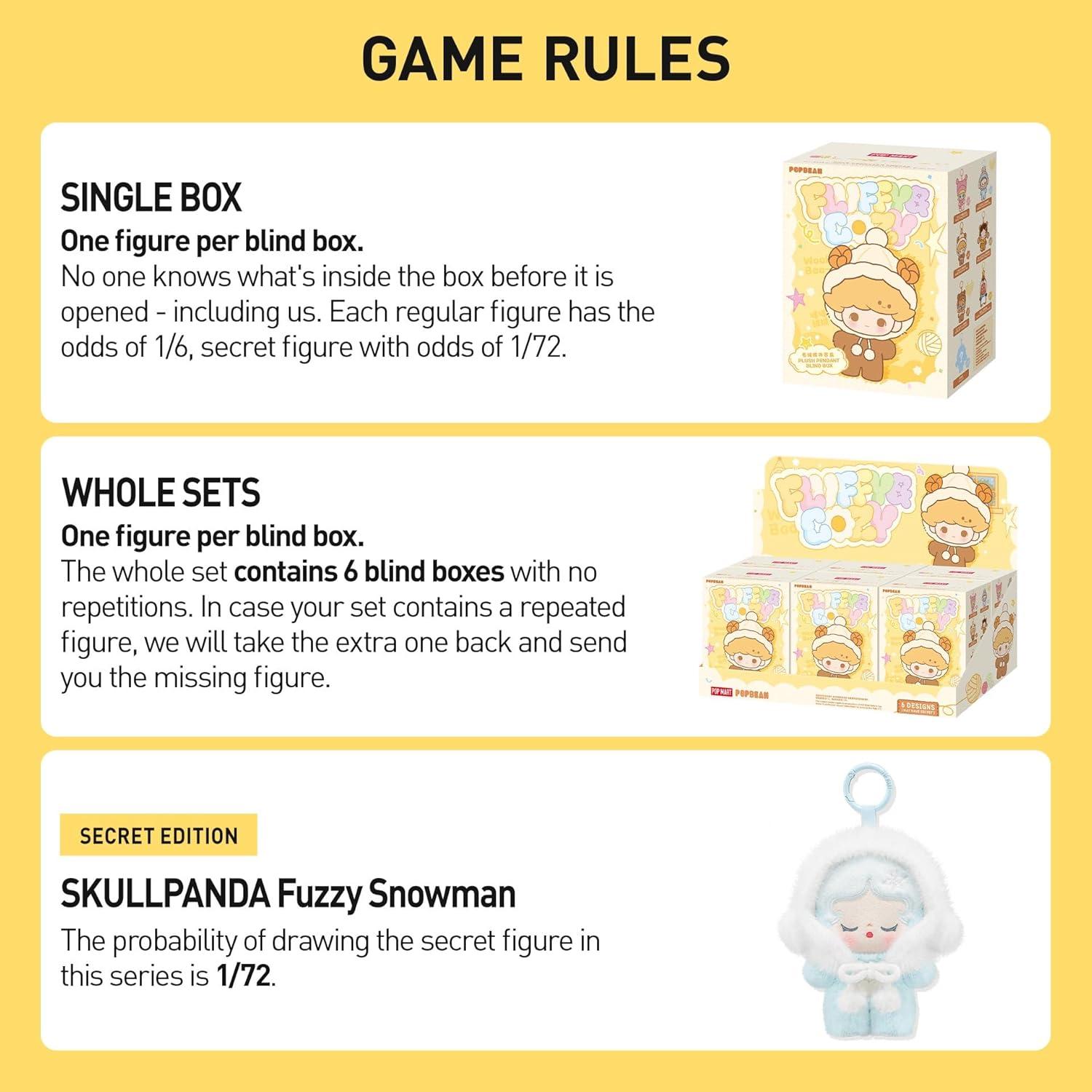 POP MART POP BEAN Fluffy & Cozy Series: The blind box contains a random figure from a specific series. Each blind box only contains one figure. No one, including us, knows what's inside. This collection contains 6 blind box figures, one of them might be the secret edition.