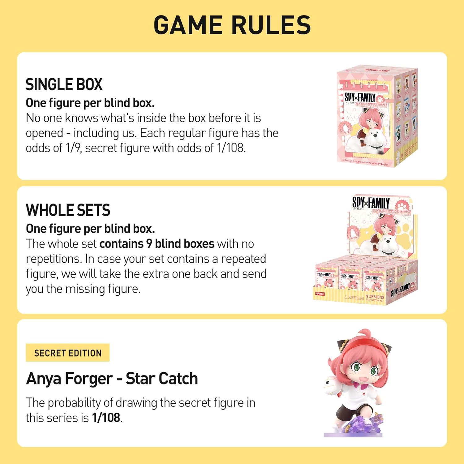 POP MART Spy ×Family Daily Life Series Figures: The blind box contains a random figure from a specific series. Each blind box only contains one figure. No one, including us, knows what's inside. This collection contains 9 blind box figures, one of them might be the secret edition.