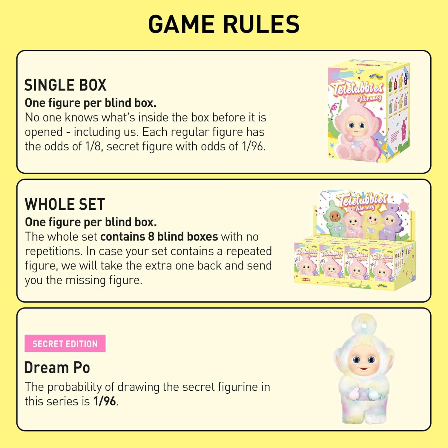 POP MART Teletubbies Vibrancy Series Figures: The blind box contains a random figure from a specific series. Each blind box only contains one figure. No one, including us, knows what's inside. This collection contains 8 blind box figures, one of them might be the secret edition.