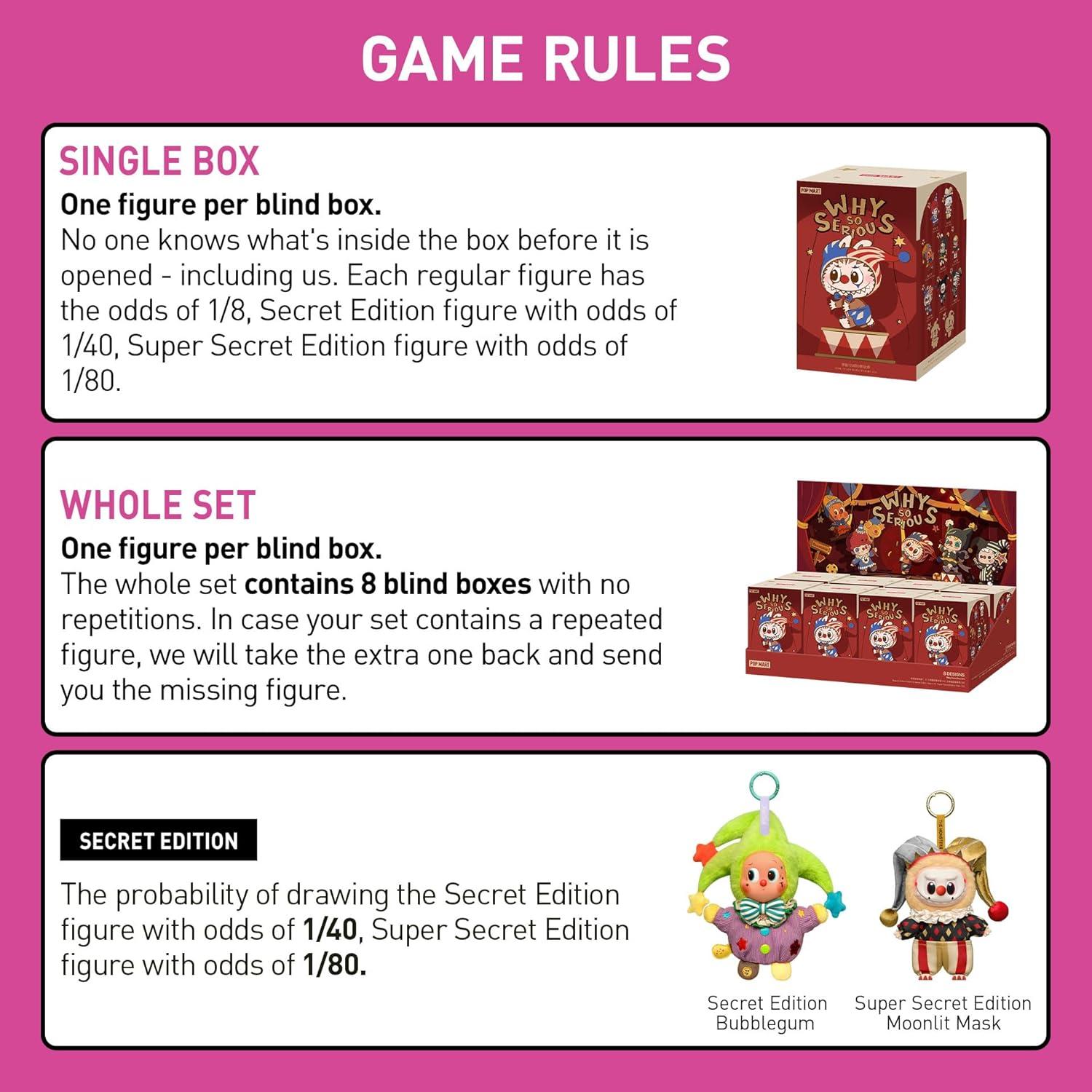 POP MART WHY SO SERIOUS Series Plush Doll Pendant: The blind box contains a random figure from a specific series. Each blind box only contains one figure. No one, including us, knows what's inside. This collection contains 8 blind box figures, one of them might be the secret edition.